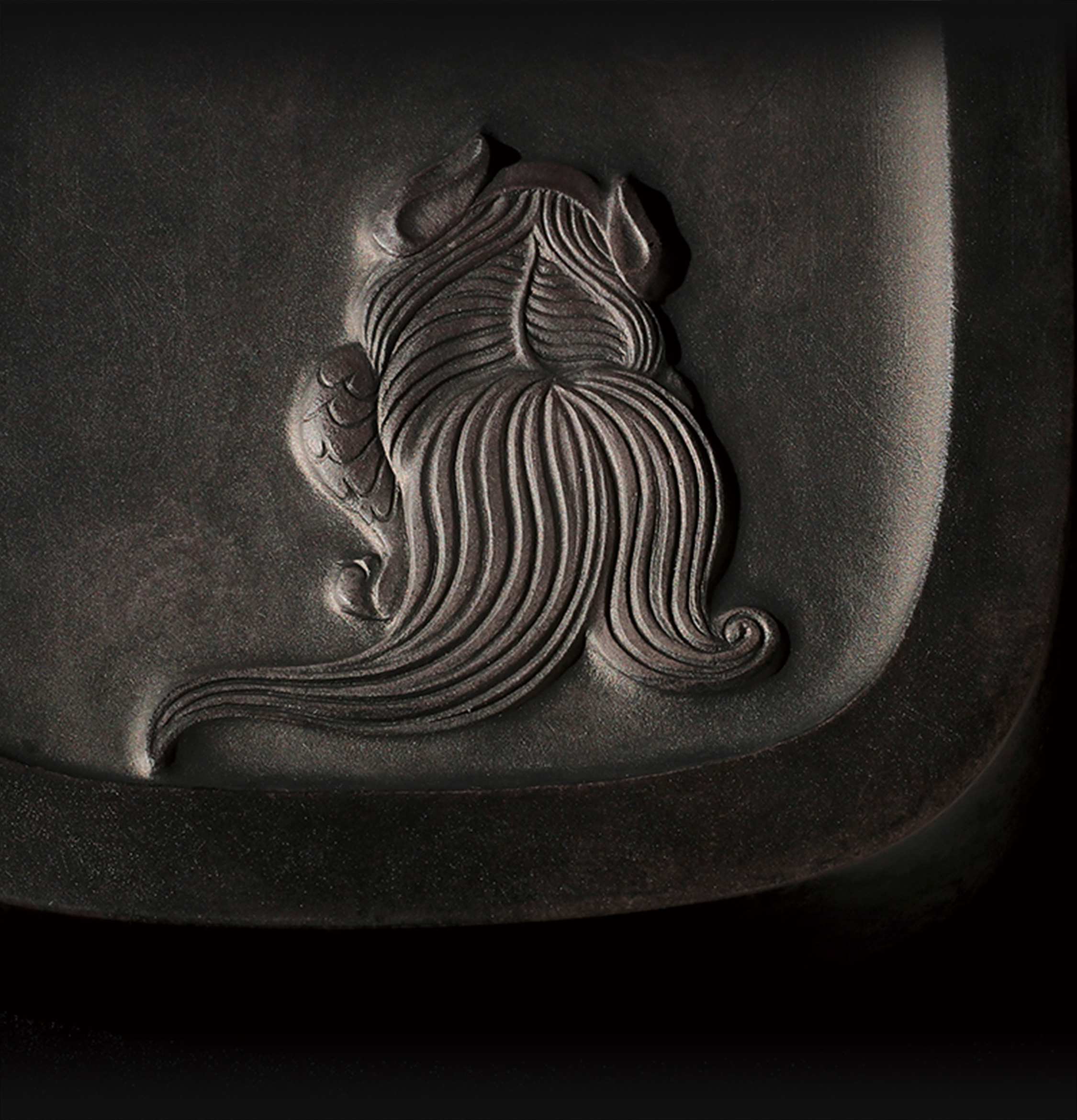 見る者にとって、己が休まる安住の地、拠り所を思い返すことができる硯の姿を目指した。背面額抜きの下部、安息のひとときの獅子の後姿のみを彫刻した。