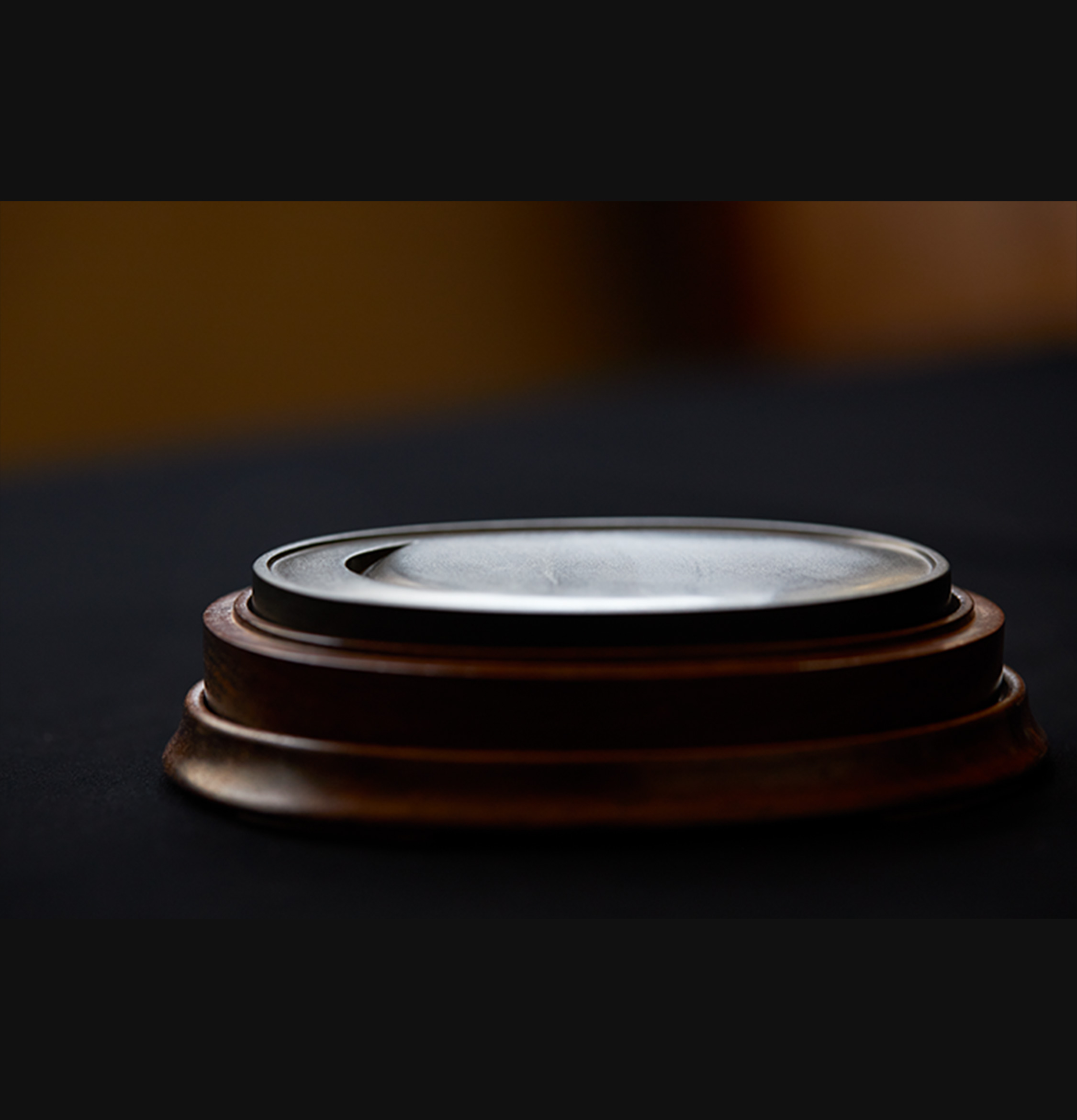 手の平サイズの中に向き合った世界観を宿したかったが、ただ小さいことで、「おもちゃ」のようになってはいけない。 まず眉状の石紋を横目に取り、正統派な構えから入った。 そして1ミリの覆輪、ミニマムな月型墨池を設置し、造形にエッジを加えることで硯相にメリハリを付けた。 小判型に整材した時、野暮ったさを回避するために厚さは1センチとし、高さを含め、木箱格納時に総合的に成立する造形を目指した。 文房清玩には硯の箱に本体と同等の価値を見出す考え方がある。 箱には小葉黒檀の材を使用することで石材色との調和を図った。 また、この硯には納める木箱ごと受ける台座を設けた。 硯の実用用途として不要に思えても、足元をしっかりと支えている。 それは視覚的効果だけではない。 小さくて、どこか良い物には、用途以外に惹きつける魅力がある。 それはきっと硯の世界だけではない。