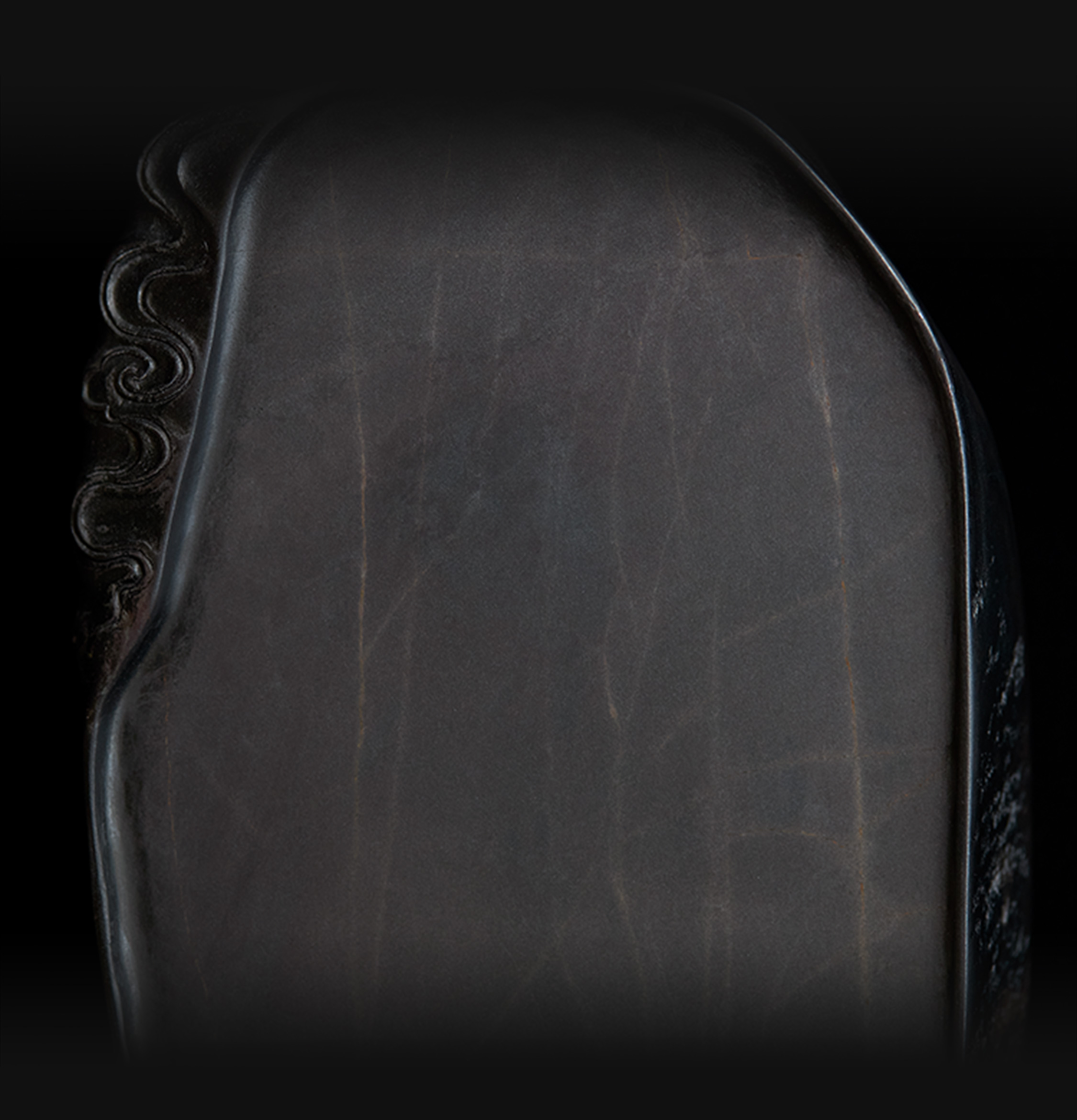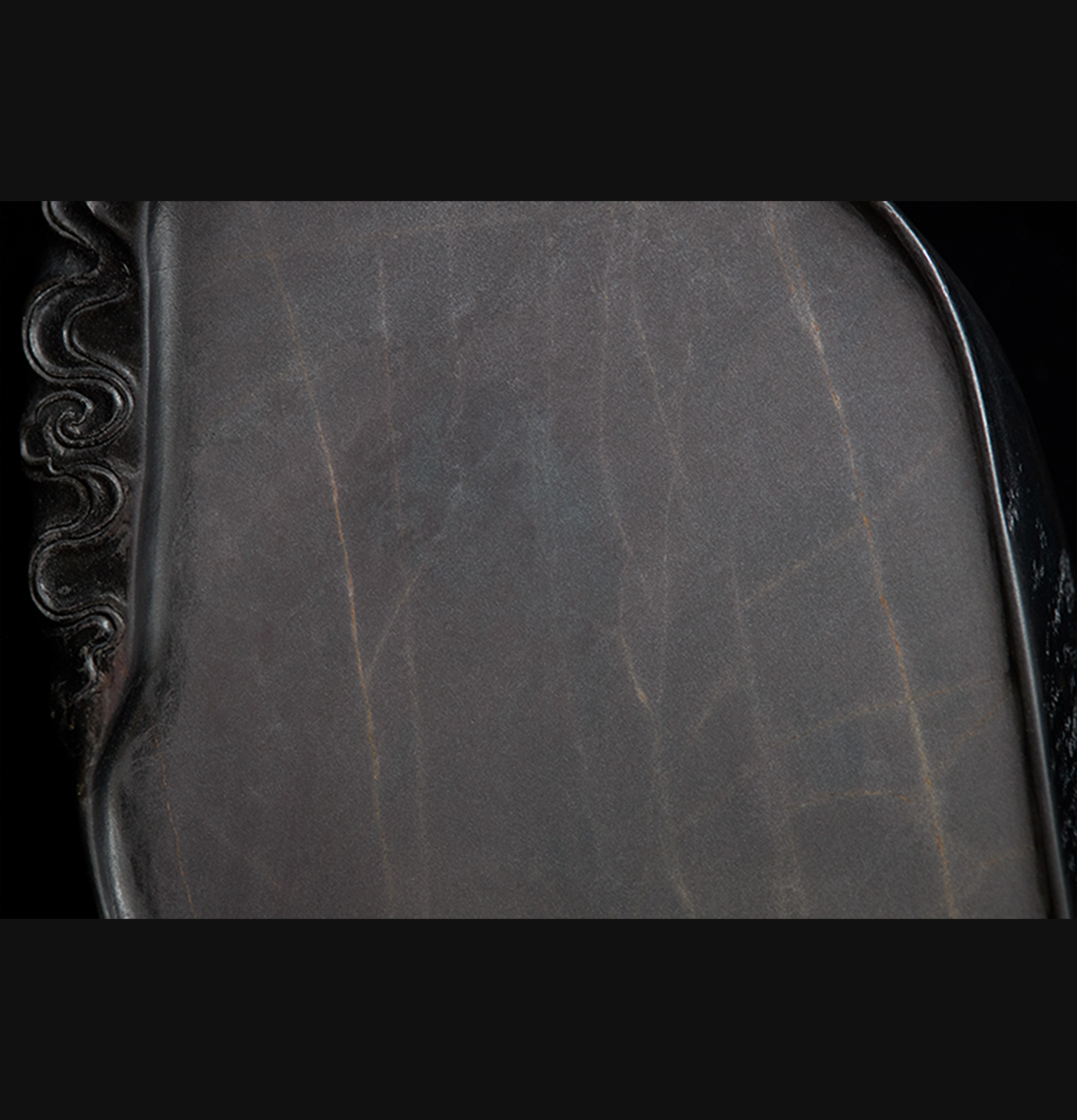 これがきっかけとなって帰国後に早速着手した。 清朝期雲紋刻硯板。彼の話していた硯の姿を目指した。 刀を進めるうちに鮮やかな石景色が広がった。 老坑はヒビが多くその部分に沿って彫刻を施すケースが多いのだが、まるでそれらしき気配のない、石のままで勝負できる素材であった。 なるほどこれは硯板向きだと頷いた。 雲紋から繋げて細い覆輪を全面に施して石景色の額縁とした。 雲はあえて少なめにした。 良い材に手工を施す場合は自己主張に走らず、材に目を向けた手段がよい。 結果施されてできた造形は視覚的効果、演出だけではなくて、硯の長い歴史の流れに沿うものだと考える。