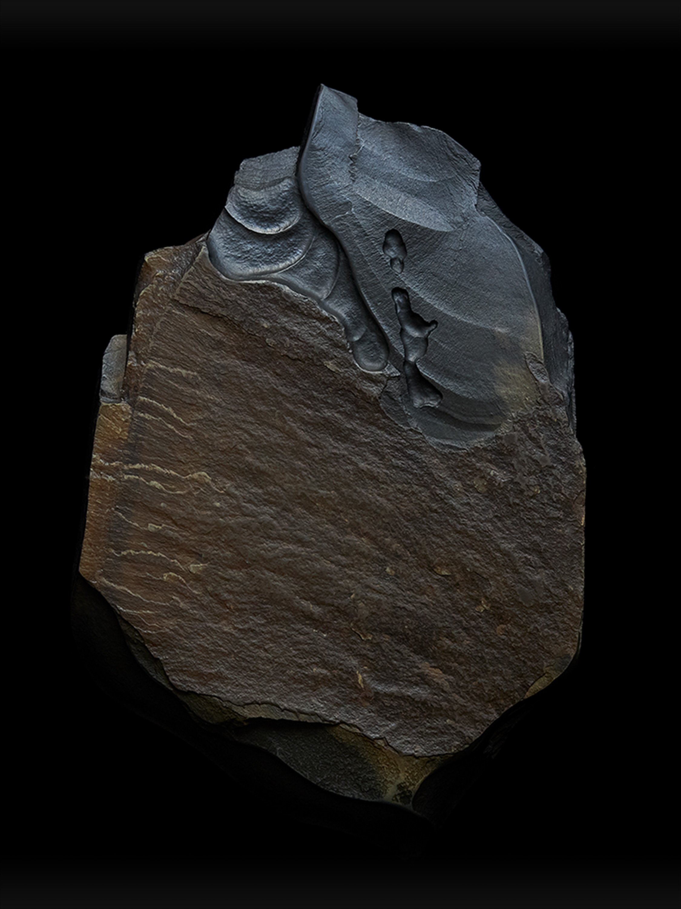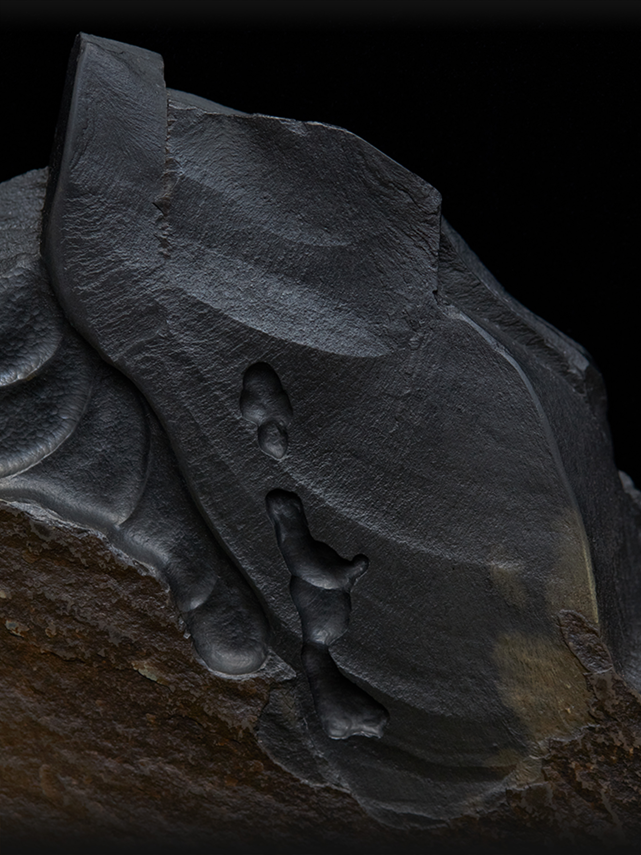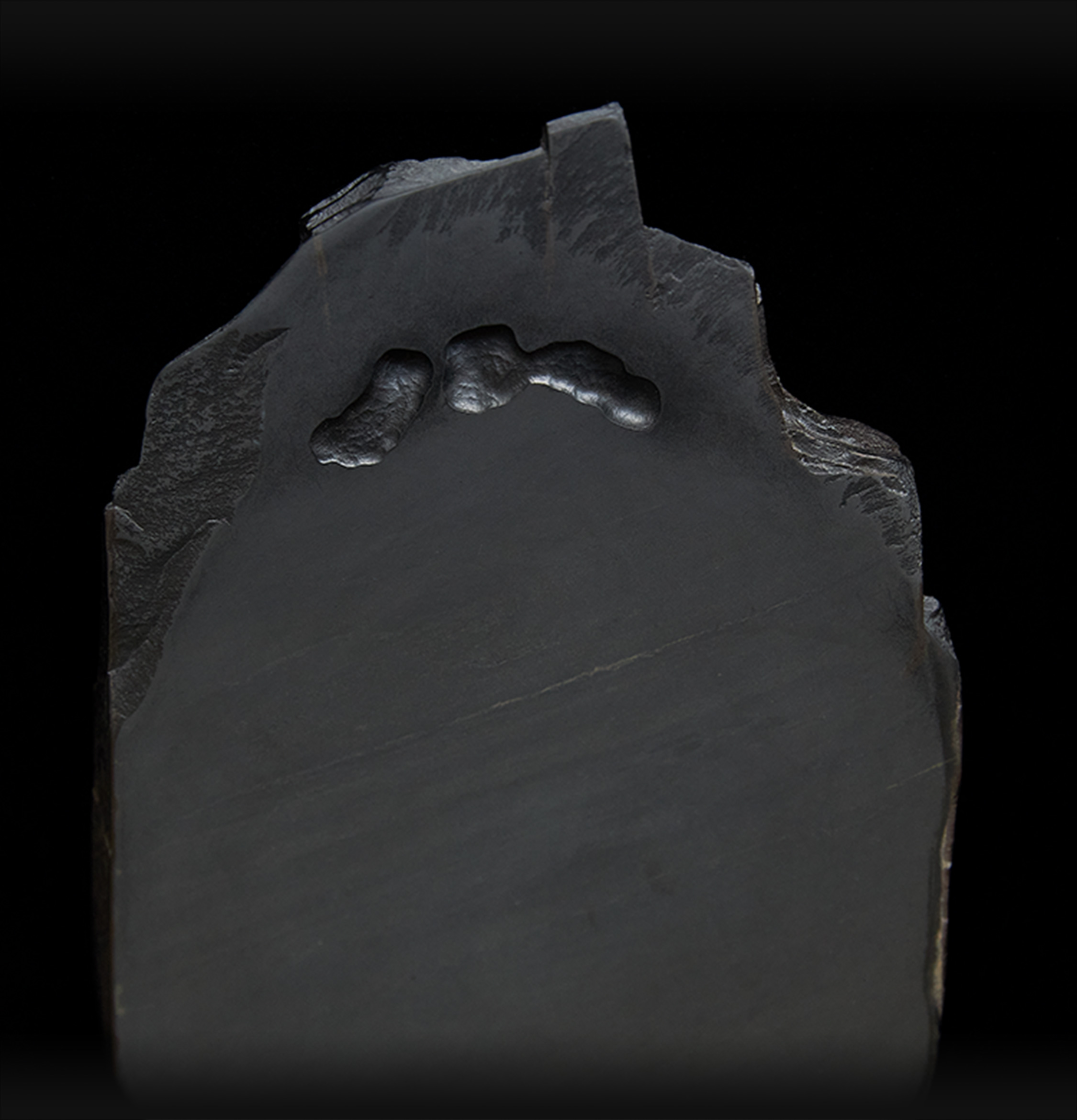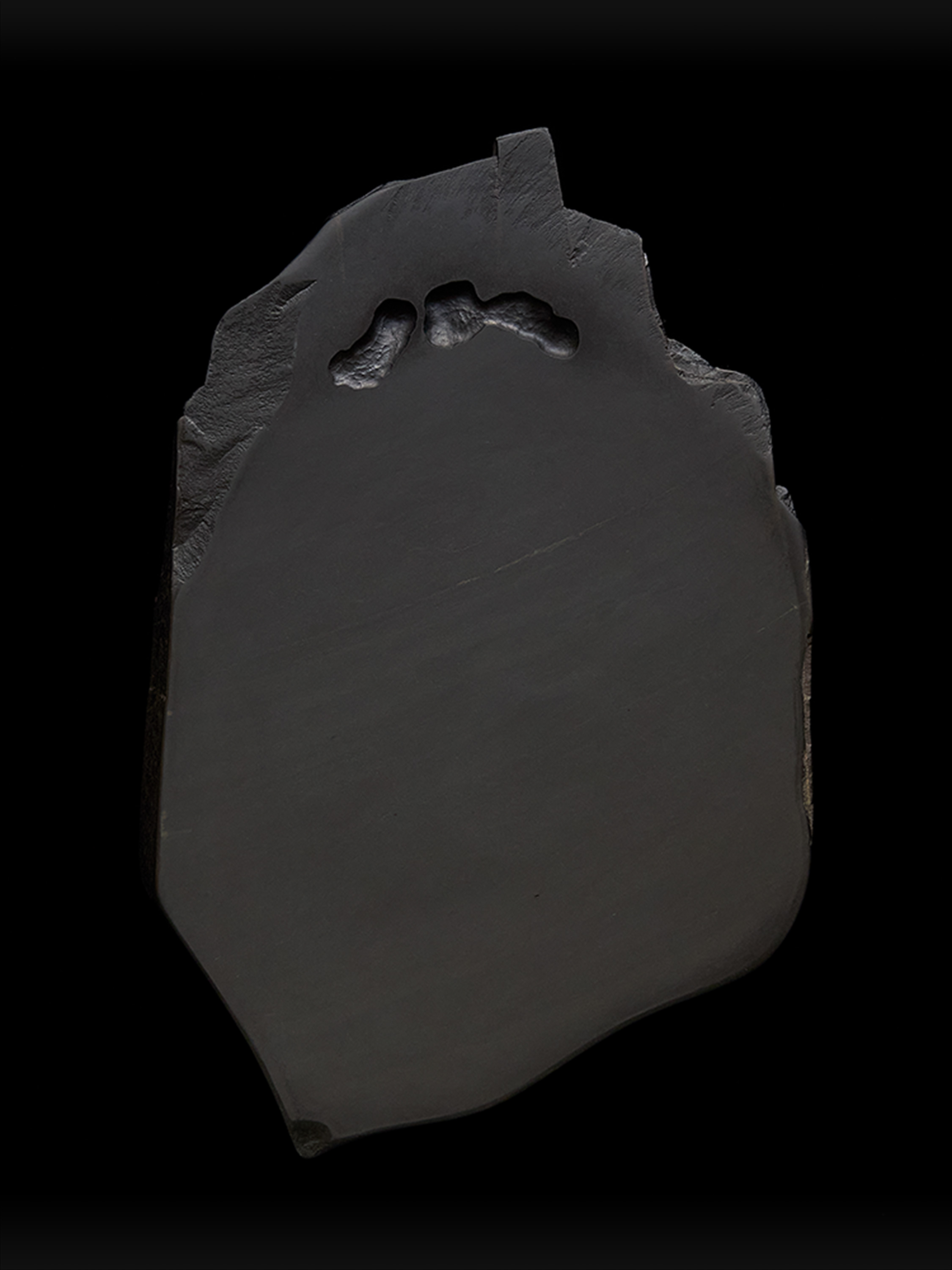 山を硯に導いた「山硯」。 制作を終えた後、浅草の工房で今一度御留石に向き合った。 知り得た山の体温、表情が鮮明なうちに硯に山を導こうと作硯した。 素材である原石の姿を活かし全景を葉に見立てた。 表は広い墨堂と小さな墨池のみとした。 墨堂は主を受け止める場所である。 山が手を広げて人を迎え入れる如く包容の大地とした。 小さい墨池は虫が食べた痕跡である。 石の虫の仕業だが、正体は石を愛する全ての者である。 虫は背面葉脈に沿って食べ進めている。 背の右半分は自然剥離を葉脈に見立てた。 左半分は調和を取り自然を模して作硯した。 背の半分を覆う黄土面は山の肌をそのまま残置した。 人間の指先の感覚は髪の毛一本の太さに反応する。 硯をその手に抱いた主の指が触れる位置に配した。