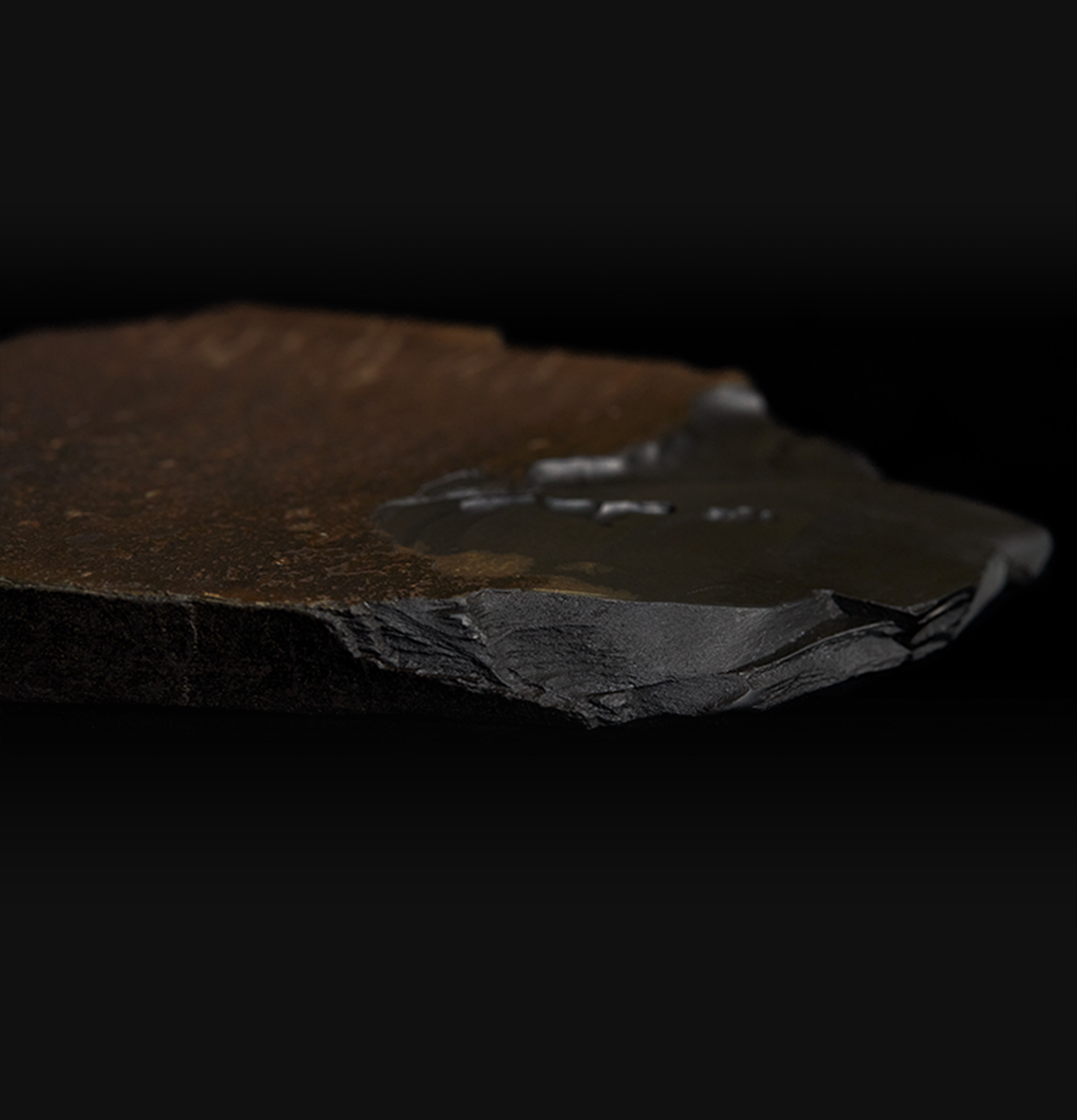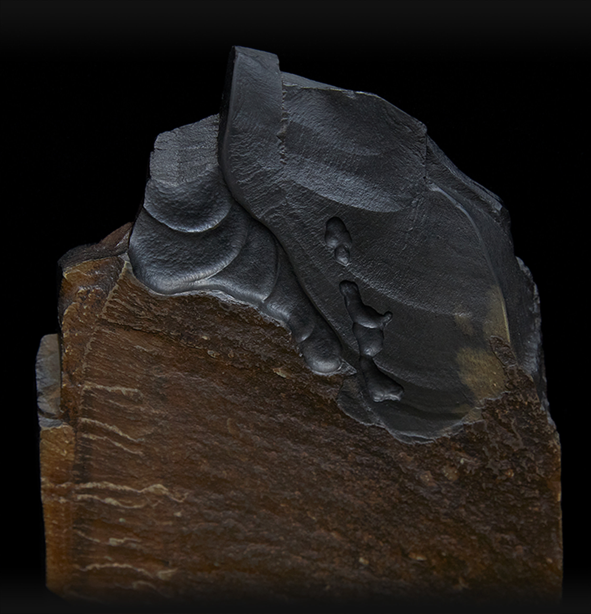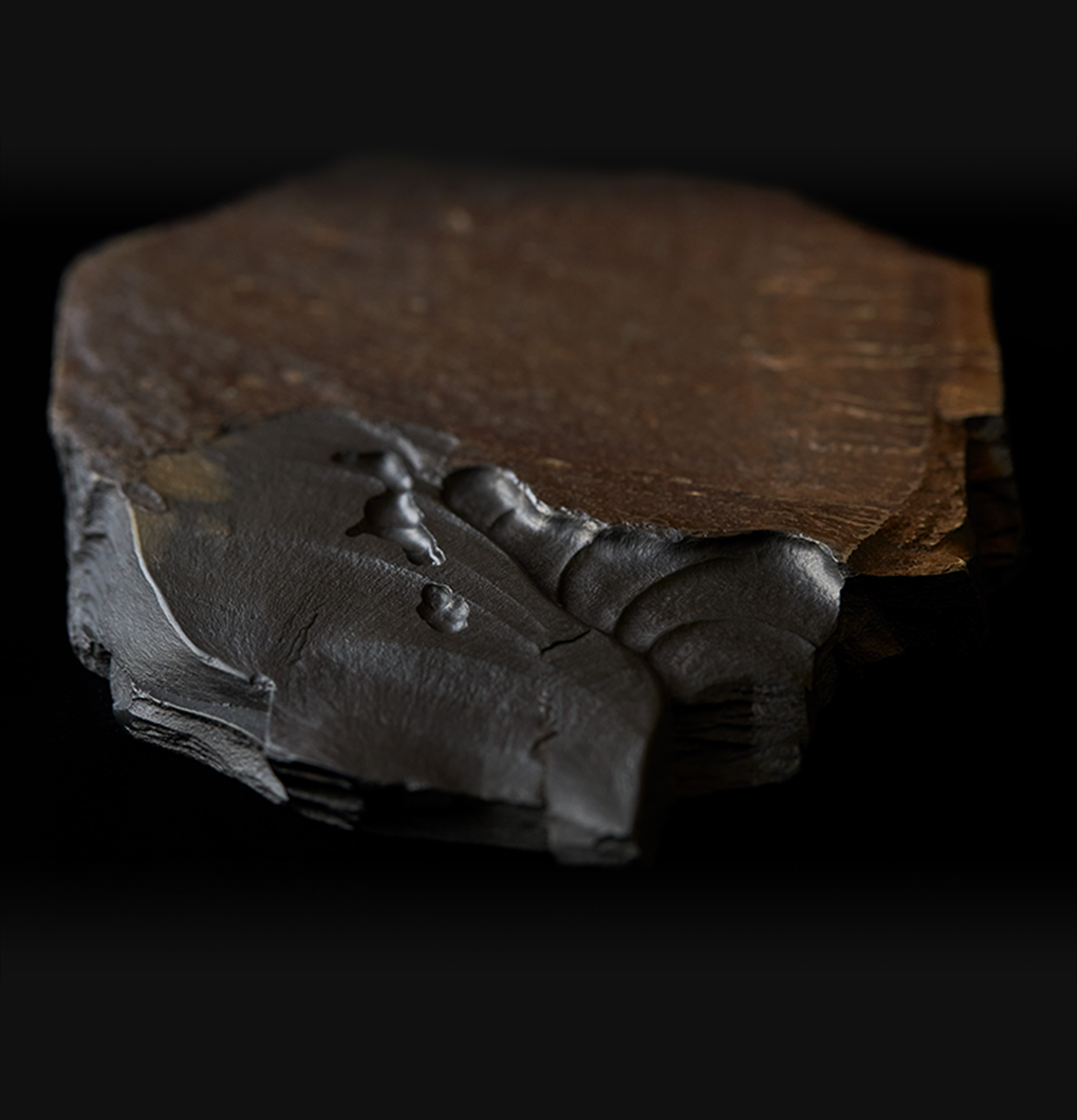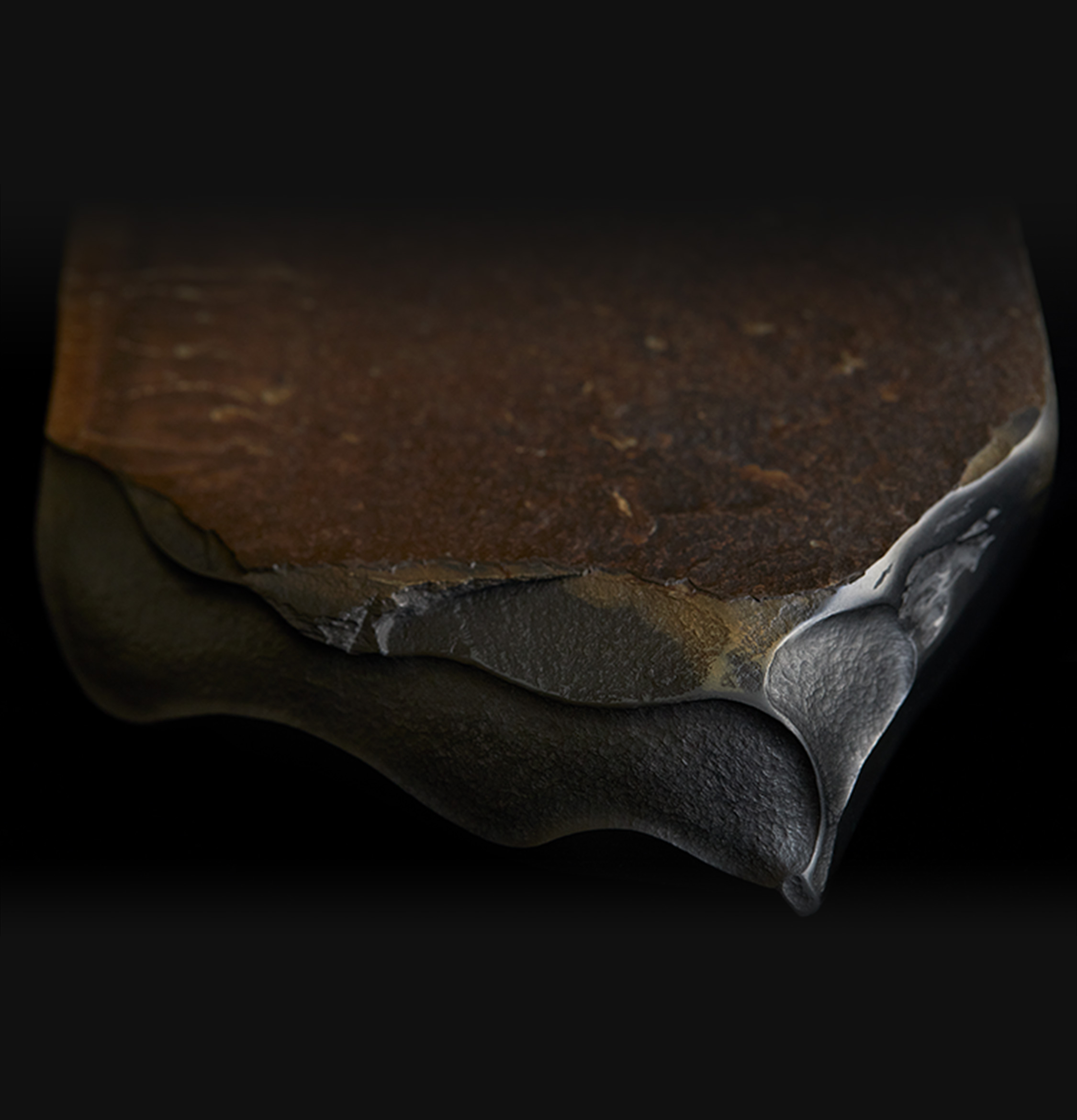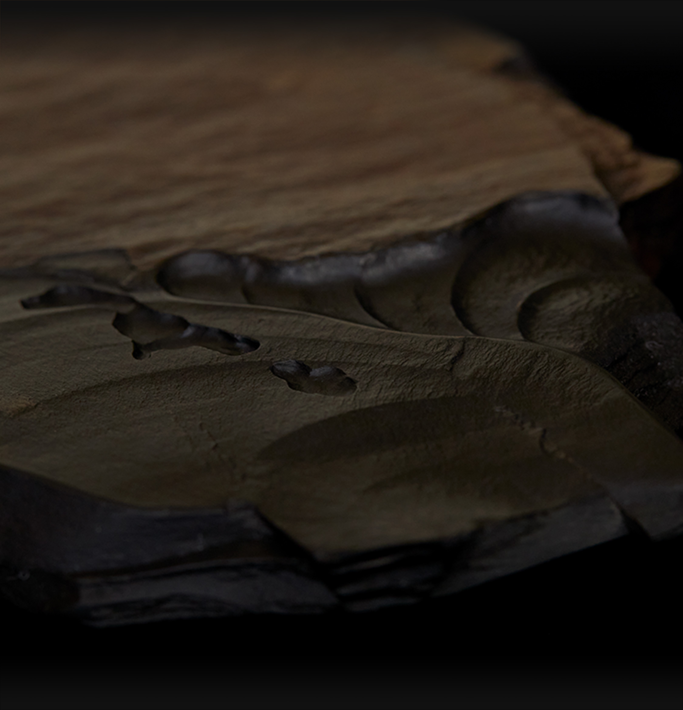 山を硯に導いた「山硯」。 制作を終えた後、浅草の工房で今一度御留石に向き合った。 知り得た山の体温、表情が鮮明なうちに硯に山を導こうと作硯した。 素材である原石の姿を活かし全景を葉に見立てた。 表は広い墨堂と小さな墨池のみとした。 墨堂は主を受け止める場所である。 山が手を広げて人を迎え入れる如く包容の大地とした。 小さい墨池は虫が食べた痕跡である。 石の虫の仕業だが、正体は石を愛する全ての者である。 虫は背面葉脈に沿って食べ進めている。 背の右半分は自然剥離を葉脈に見立てた。 左半分は調和を取り自然を模して作硯した。 背の半分を覆う黄土面は山の肌をそのまま残置した。 人間の指先の感覚は髪の毛一本の太さに反応する。 硯をその手に抱いた主の指が触れる位置に配した。
